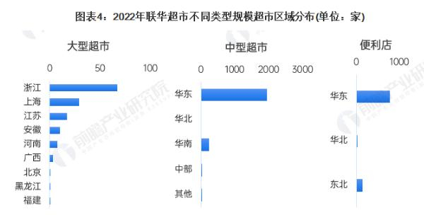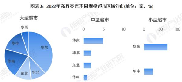 以行业领先的超市品牌为例分析,高鑫零售主要以大型超市业态为主,联华超市主要以中型超市业态为主。截至2022年财年中期,高鑫零售大型超市主要分布于华东和华南地区,分别有大卖场185家和98家。公司大型和中型超市大约7%位于一线城市,16.5%位于二线城市,47.2%位于三线城市,21.4%位于四线城市,7.8%位于五线城市。2022年,联华中型超市累计共2268家,其中有85.76%的超市分布于华东地区。