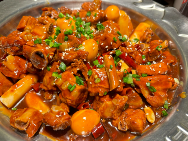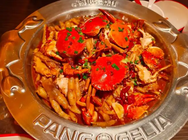 胖哥俩肉蟹煲的味道精髓源自秘制的酱汁,爆炒焖煮收汁后包裹着食材,色泽红亮,酱香浓郁,滋味悠长。