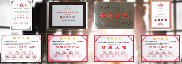 “上海名优食品”、”十大畅销品牌”、“五星级先进单位”等荣誉称号,荣获商业特许经营体系评定企业AAA级。