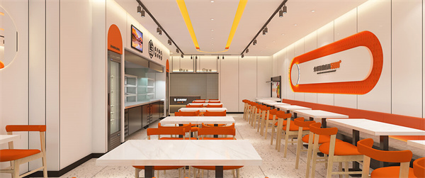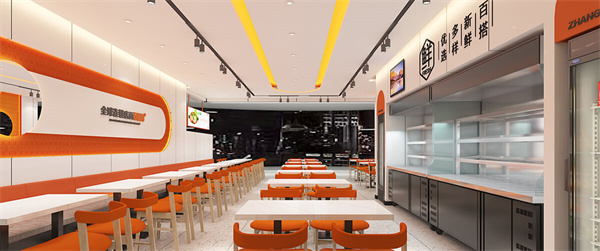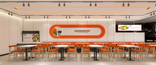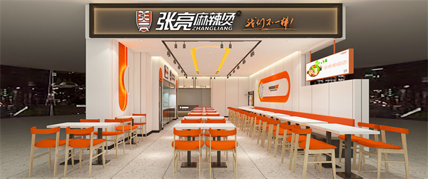 第五代店面设计秉承着“少即是多”的简约设计哲学,围绕着青春、活力、时尚的主题,以品牌logo的活力橙作为设计的色彩基调,多层次提高空间的运用,凸显了张亮麻辣烫品牌独特的色彩和造型理念。