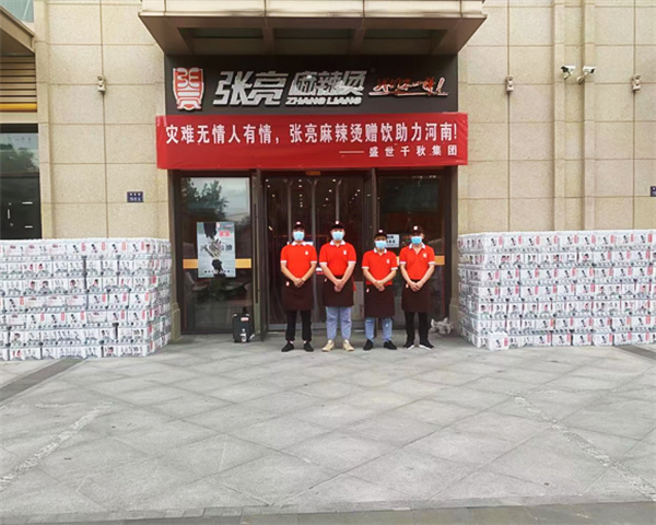 2021年7月20日郑州内涝灾害中,张亮麻辣烫连夜成立了应急小组,全力抢修受损店铺,尽力帮助受灾加盟商挽回经济损失。张亮麻辣烫还依托直营店,为参与抗洪救灾的医护人员、人民子弟兵、环卫工人、志愿者和广大受灾同胞提供免费的饮用水和食物,并且开放店面为受灾群众提供临时休息避险的场所。
