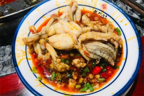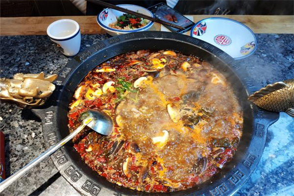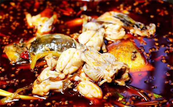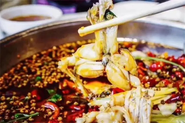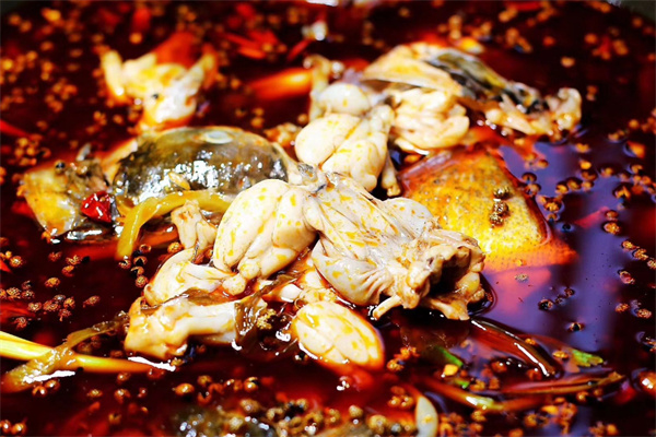以新鲜牛蛙和鱼头为主料,搭配多种香料与中草药熬制的汤底,汤底采用4种产地辣椒与花椒等天然原料调配,中和传统火锅的燥辣感,形成独特风味。
