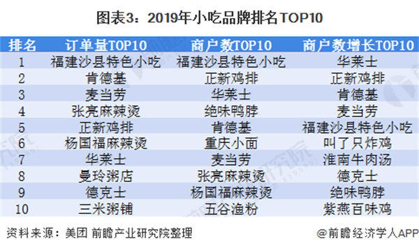 美团平台大数据显示,2019年小吃品类店铺数量排名前五的品牌是福建沙县特色小吃、正新鸡排、华莱士、绝味鸭脖、肯德基;新增商户增长最快的品牌是华莱士、正新鸡排、肯德基、麦当劳、福建沙县特色小吃;订单量排名前五的品牌为福建沙县特色小吃、肯德基、麦当劳、张亮麻辣烫、正新鸡排。从品牌TOP榜单中可以看出,小吃品类的国外品牌主要以肯德基、麦当劳等快餐品牌为代表,国内的小吃品牌则更加多元。