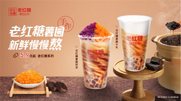 为应对消费降级的市场大环境,2024年快乐番薯根据自身优势成立了“老红糖薯圆奶茶”品牌。老红糖薯圆奶茶以小料“薯圆”为特色,背靠快乐番薯强大的供应链和运营团队,具备了“运营成本低,备料少、夏购率高”的特点。老红糖薯圆奶茶主张“茶饮高价值,售价低价格”,以小料薯圆为特色,打造“极致性价比”真正做到“好喝不贵”