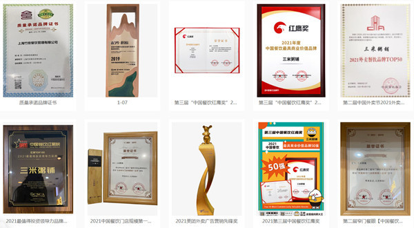 三米粥铺2016年10月创立于上海,品牌创始团队来自有10余年线下连锁餐饮经验的“老炮”和极具互联网运作经验的精英团队,一开业即引爆。2017年5月,品牌正式开放加盟,创新“堂食+外卖”经营模式,从1发展到1100+,在全国大中小城市设立了20多家代理商,合作门店遍布全国,帮助全国万千餐饮创业者走上成功之路。 三米粥铺招牌产品皮蛋瘦肉粥,年销千万份,是名副其实的皮蛋瘦肉粥大王!三米粥铺还提供丰富佐餐小菜、特色小吃和大众点心,满足多样食粥配餐需求。2020年到2021年,三米粥铺连续两年荣获窄门餐眼、红餐网等行业权威机构所颁发的奖项。