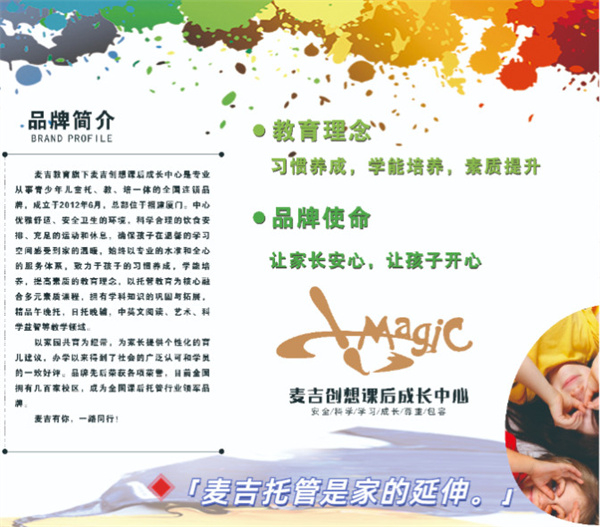 麦吉教育旗下麦吉创想课后成长中心是专业从事青少年儿童专业从事青少年儿童托、教、培一体的全国连锁品牌,成立于2012年6月,总部位于福建厦门。中心优雅舒适、安全卫生的环境,科学合理的饮食安排、充足的运动和休息,确保孩子在温馨的学习空间感受到家的温暖,始终以专业的水准和全心的服务体系,致力于孩子的习惯养成,学能培养,素质提升的教育理念,以托管教育为核心采用1+N模式,融合多元素质课程,拥有学科知识的巩固与拓展,精品午晚托,日托,中英文阅读、艺术、国学、益智等教学领域,提供课后综合性托管服务体验中心。