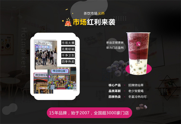 悸动烧仙草成立于2007年,经过15年高速发展,目前全国门店已超3000家,,悸动烧仙草已成为烧仙草品类名副其实的领军者。