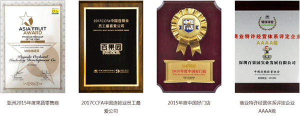 2015年,百果园荣获“年度果蔬零售商”称号。同年,获得中国连锁经营协会颁发“中国优秀特许品牌”殊荣。