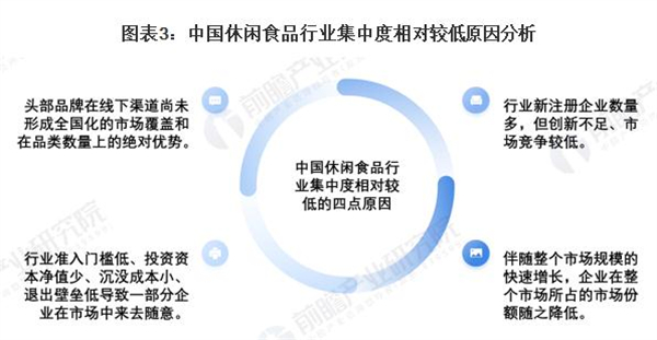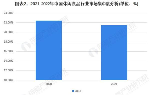 有关数据显示,2020年我国休闲食品市场前15名市场份额为22.4%,2021年,前15名市场份额进一步降低,为21.5%,整体来看,市场竞争格局分散,集中度相对偏低。