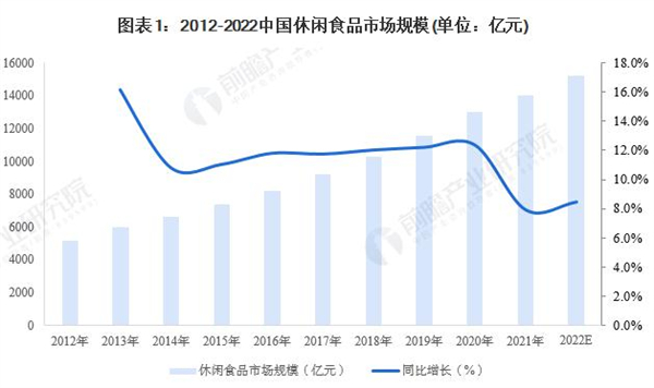 根据国际咨询机构Frost & Sullivan统计,2011-2018年我国休闲食品行业实现快速扩容,年复合增长率达到12.3%,2018年休闲食品行业市场规模达到10297亿元,同比增长12.0%。从近几年我国休闲食品行业市场规模整个变化趋势来看,我国休闲食品行业将呈现出长期稳定增长的态势,到2021年,全国休闲食品市场规模增长至14015亿元,同比增长7.9%,初步统计2022年可达15204亿元。