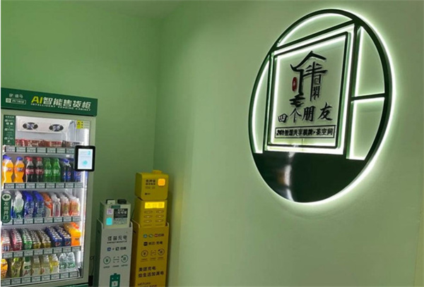 店内张贴操作流程图,顾客到店后通过手机小程序就可以完成开门、续费等一系列操作,店内提供自助泡茶、无人售货机等