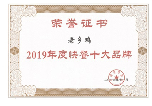 2019年12月,2019年度餐饮业十大品牌揭晓,老乡鸡荣获2019度快餐十大品牌。