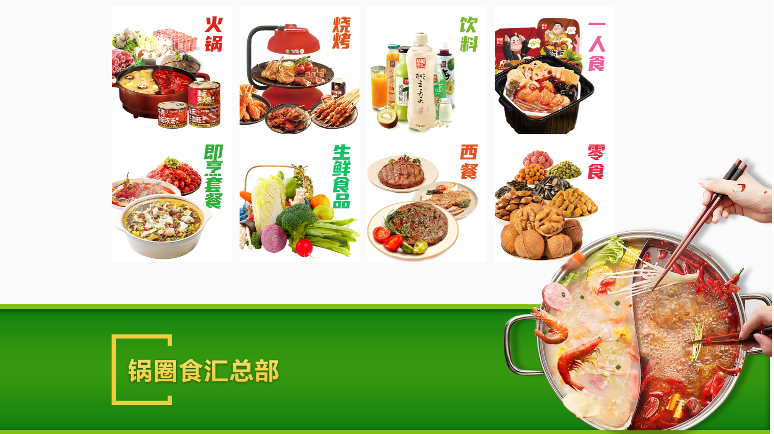 锅圈食汇是以火锅、烧烤食材为主,涵盖冻品、生鲜、小吃、底料蘸酱、四季饮品、火锅器具、烧烤器具等多种品类的超市便利店连锁系统