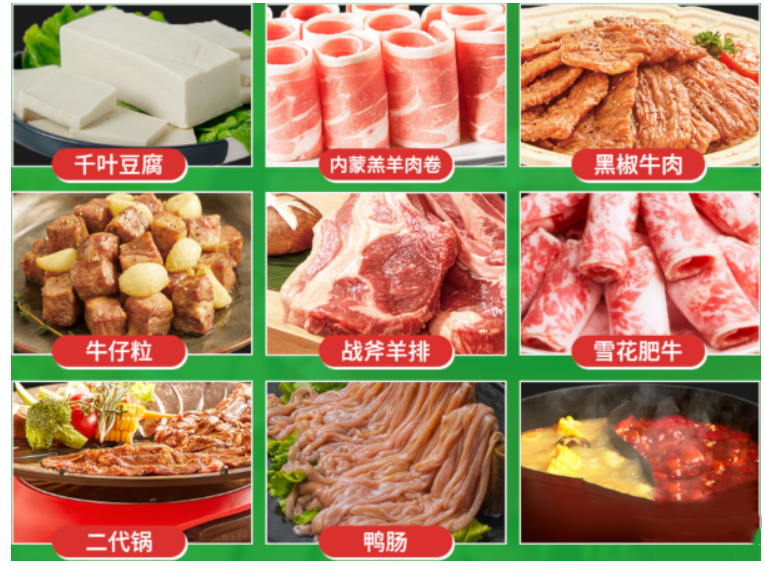 底料蘸酱类、底料小吃类、牛羊肉类、川渝特色类、丸滑类、烧烤系列、时令蔬菜、酒水类、粉面类、用品用具类等